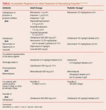 In a review of patient medical records, Wong et al15 demonstrated that prompt recognition and surgical management of necrotizing fasciitis (ie, within 24 hours of presentation) resulted in improved outcomes. Since the particular causative agent of necrotizing fasciitis in each case is usually unknown, initial treatment should include broad-spectrum IV antibiotics— which are active against grampositive, gram-negative, and anaerobic bacteria—with special consideration for GAS and Clostridium (Table). It is not recommended that initial empiric therapy include antifungals. In this case, the patient was in the OR within 10 hours from presentation, was started immediately on antibiotic regimens for hospital-specific sepsis, and was given appropriate resuscitative measures.