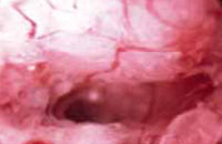 Photograph taken at hysteroscopy displaying shaggy, irregular endometrium with abnormal blood vessels. Microscopic examination revealed complex endometrial hyperplasia with atypia.