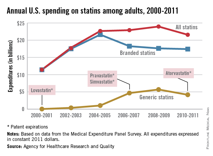 Simvastatin and pravastatin both became generic in 2006 and spending on generic statins increased by over 300% by 2010-2011 to $4.2 billion. Overall spending for statins was $21.6 billion in 2010-2011, with branded drugs representing $17.4 billion of that total, the AHRQ reported.