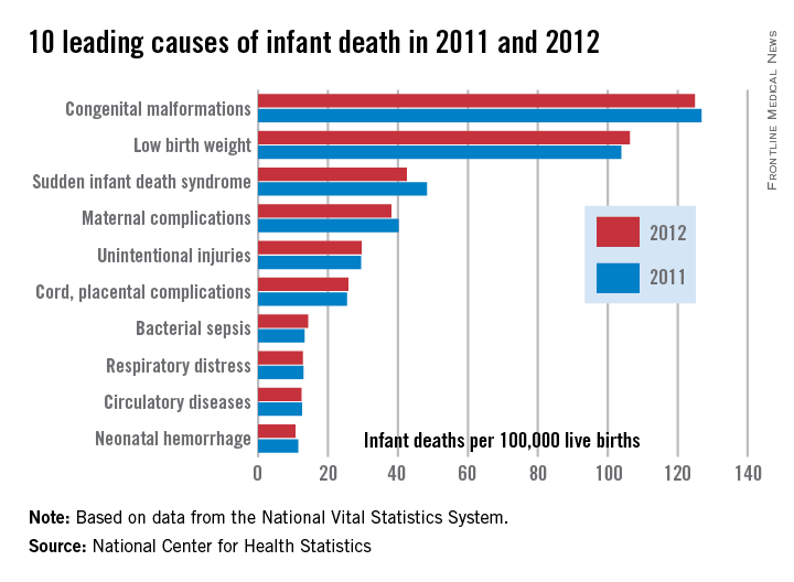 Among the 10 leading causes of infant mortality, the rate decreased slightly for congenital malformations from 126.8/100,000 births in 2011 to 12/100,000 births in 2012, while the rate for low birth weight increased slightly from 2011 to 2012, rising from 103.9/100,000 births to 106.3/100,000 births. With a decrease of 12%, the mortality rate for sudden infant death syndrome had the only significant change, falling from 48.3/100,000 births to 42.5/100,000 births, the NCHS reported. All leading causes of death remained the same from 2011 to 2012.